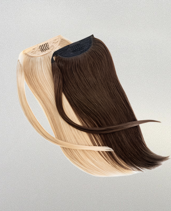 Construction: Drawstring, wrap-around, or clip-in ponytails